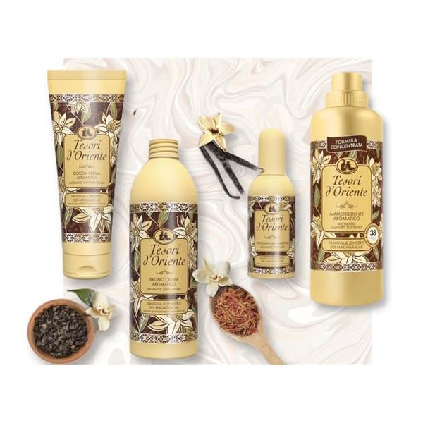 Tesori d'Oriente Vani & Gừng: là sự kết hợp nhẹ nhàng nhưng mạnh mẽ với hương thơm cay ấm của gừng hòa quyện cùng tinh chất vani ấm áp, nồng nang từ Madagascar. Được làm giàu với dầu Macadamia quý giá, với đặc tính dưỡng ẩm và làm mềm da, sản phẩm nhẹ nhàng làm sạch da, mang lại làn da mịn màng và mềm mại như nhung.