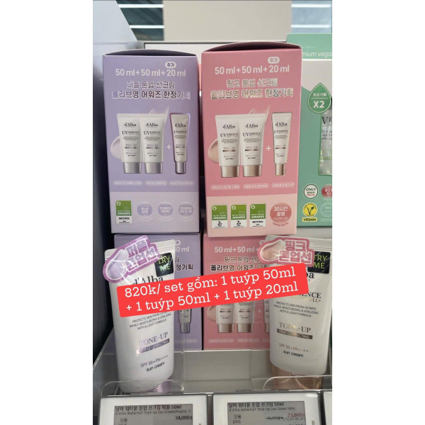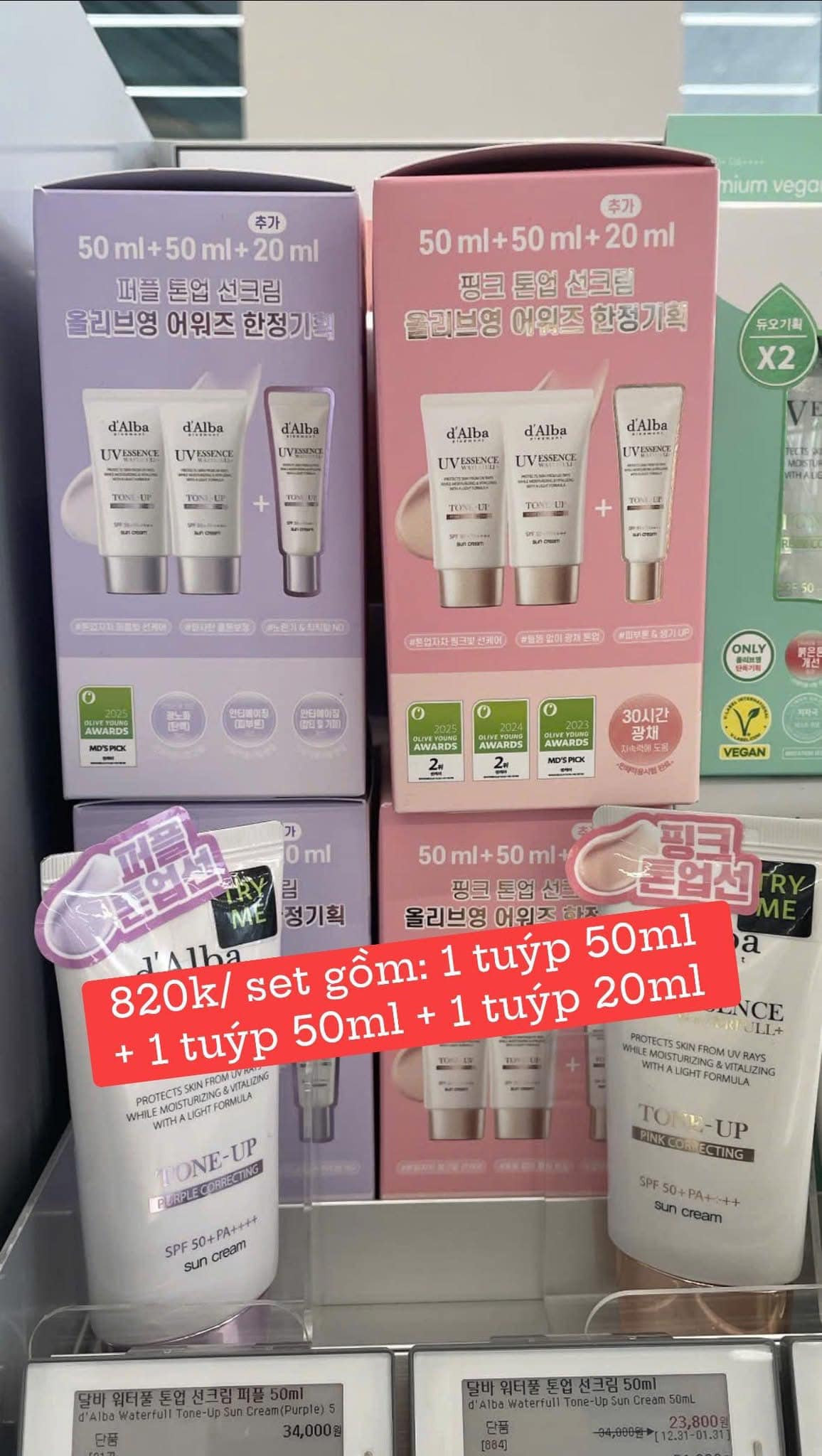Kem chống nắng d’Alba UV Essence Waterfull+ Tone Up spf5O/PA++++ Purple Correcting giúp hiệu chỉnh tông da vàng xỉn màu, giúp nâng tông da sáng trong hơn, phù hợp hoàn hảo cho làn da vàng Châu Á.